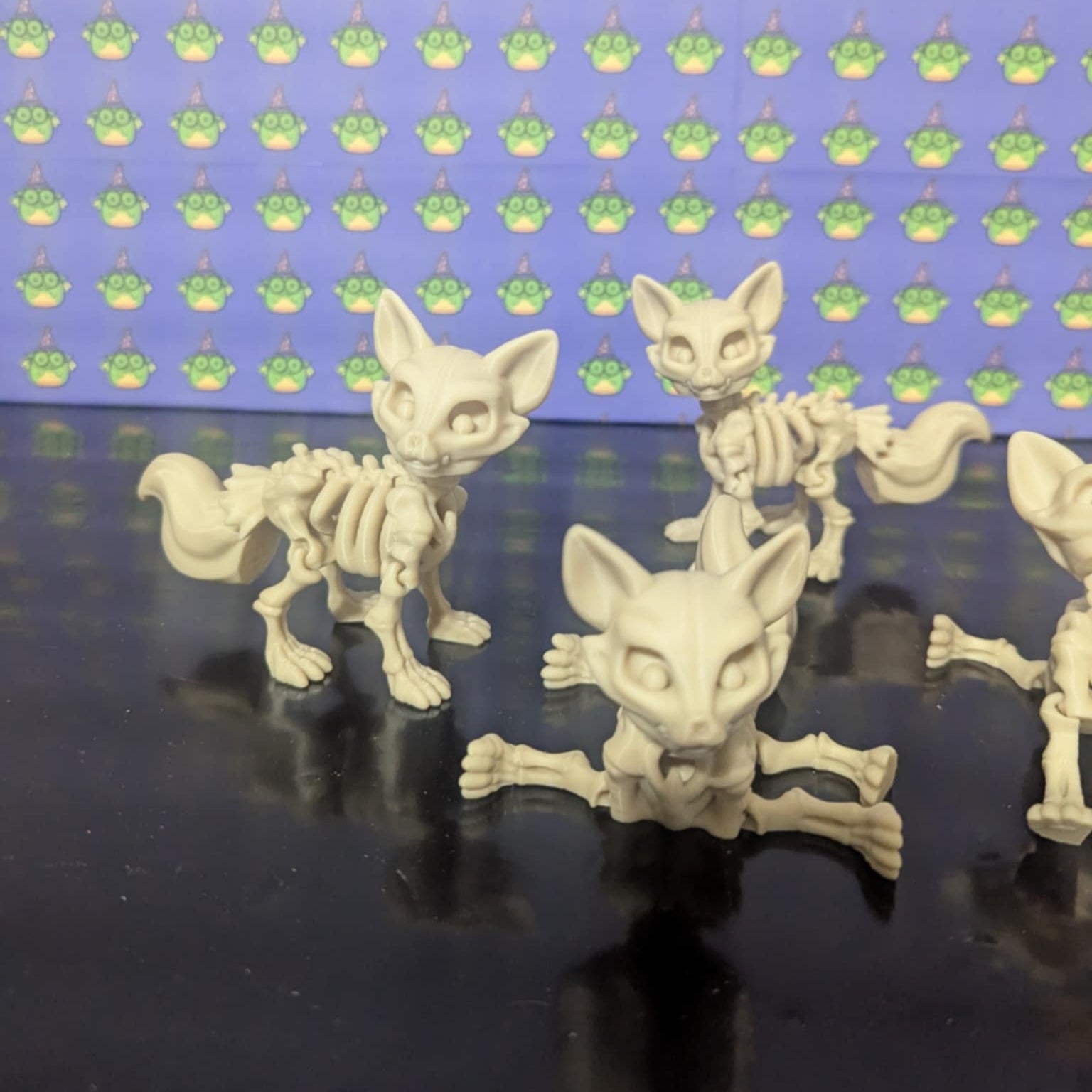 Look at this spooky squad of adorable! These aren't your garden-variety foxes; they've gone full-on bone chic! With their articulated joints, these flexi-skeleton foxes can strike any pose you fancy – whether they're doing a playful pounce, a sly slink, or just chilling in their skeletal splendor. Their sweet little faces and bushy tails, even in their bony state, just scream "cuddle me... if you dare!" They're the perfect blend of spooky and sweet, ready to add a touch of whimsical weirdness to your day. These little bone rascals are definitely ready for some Halloween hijinks or just some year-round eerie elegance!