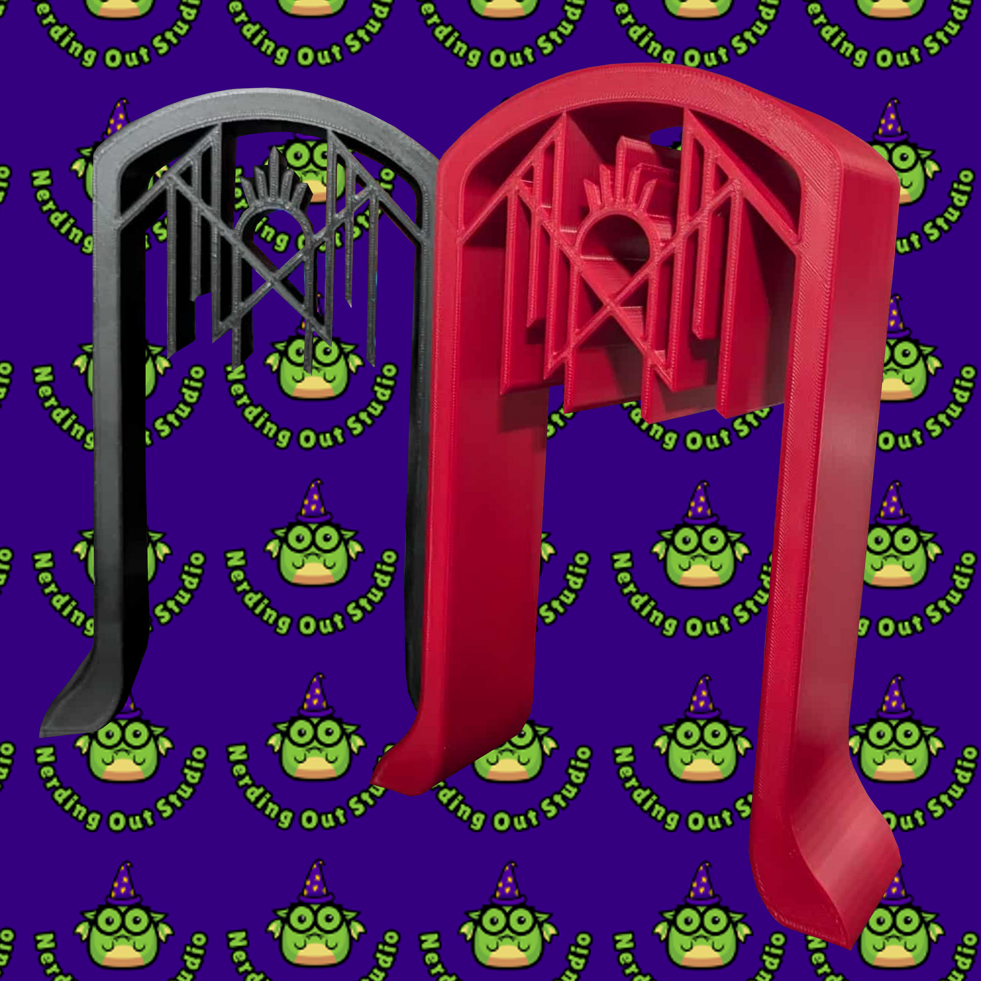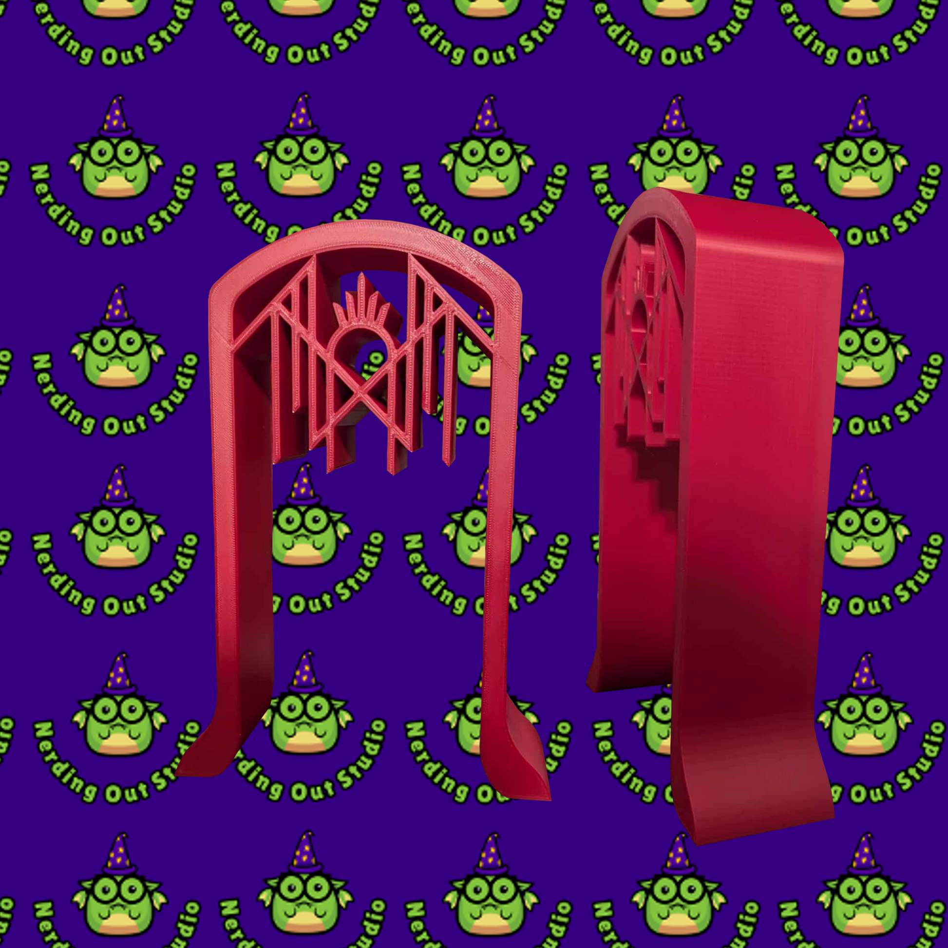 Crafted with a sleek, minimalist silhouette, the stand features a striking, stylized archway design that evokes the ceremonial and atmospheric essence of the band's visuals. The central motif, reminiscent of the Sleep Token logo, is intricately detailed, adding a touch of worship to any desk or studio space.