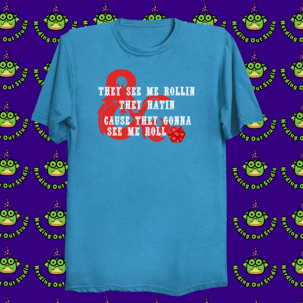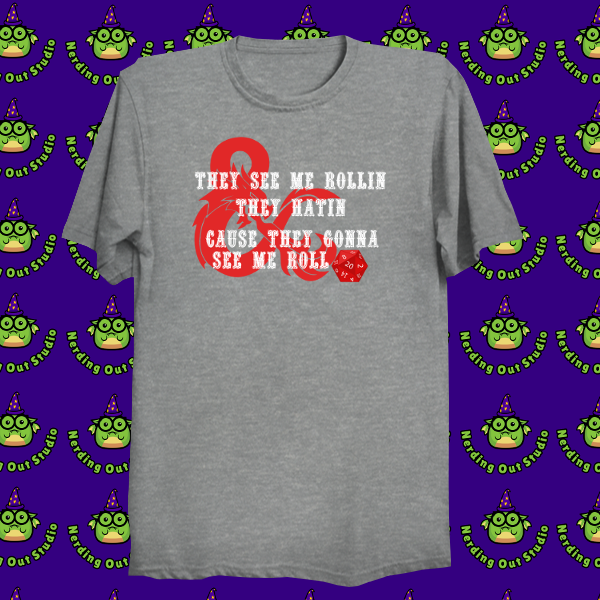 Prepare for a dexterity saving throw against laughter with this epic t-shirt! Featuring the legendary phrase 'They See Me Rollin', They Hatin', Cause They Gonna See Me Roll,' this design is a playful nod to both classic hip-hop and the glorious world of tabletop RPGs.